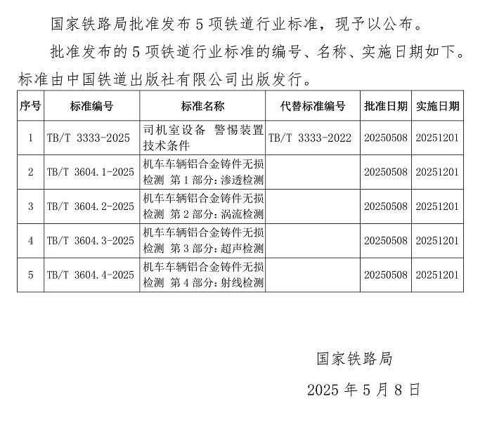 國家鐵路局發布《司機室設備 警惕裝置技術條件》等5項鐵道行業技術標準。